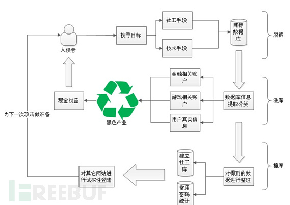 下图是黑客,在“脱裤”“洗库”“撞库”三个环节所进行的活动。